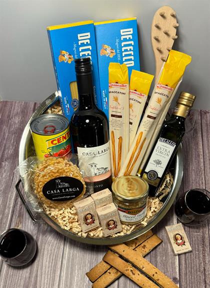 Everything you need for a perfect pasta night for four, beautifully presented in a stainless-steel colander. This gift pairs Casa Larga’s Tramonto Estate Red Wine with gourmet ingredients and treats for a complete, memorable dining experience.